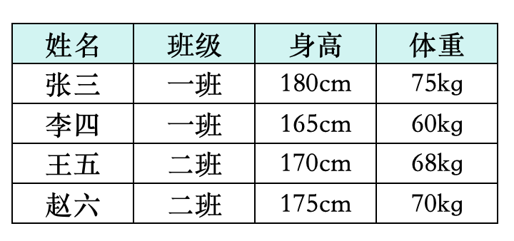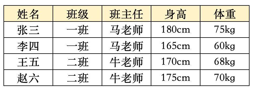 - 例如下面身高体重表,每行都记录了一个人的姓名、班级、身高和体重,而并没有灵活性可以记录额外的信息: