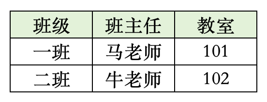 - 例如,我们的数据库中有两张表,一张就是上面的身高体重表,另一张是班级信息表: